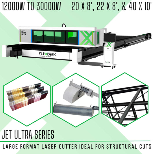 12000W to 30000W Large Format Metal Cutter FlexMax Fiber Laser JET ULTRA Series 20x8', 26x8' and 40x10' Worktables