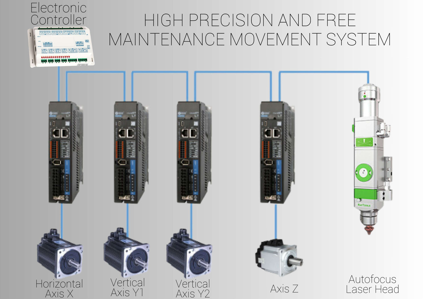 High precision, detailed capacity, and speed are crucial to obtaining the best laser cutting quality. FlexMax Laser incorporates servo motors on the steel X, Y, and X axes and digitally controlled drivers. Servo technology is known for its high precision and smooth movements.