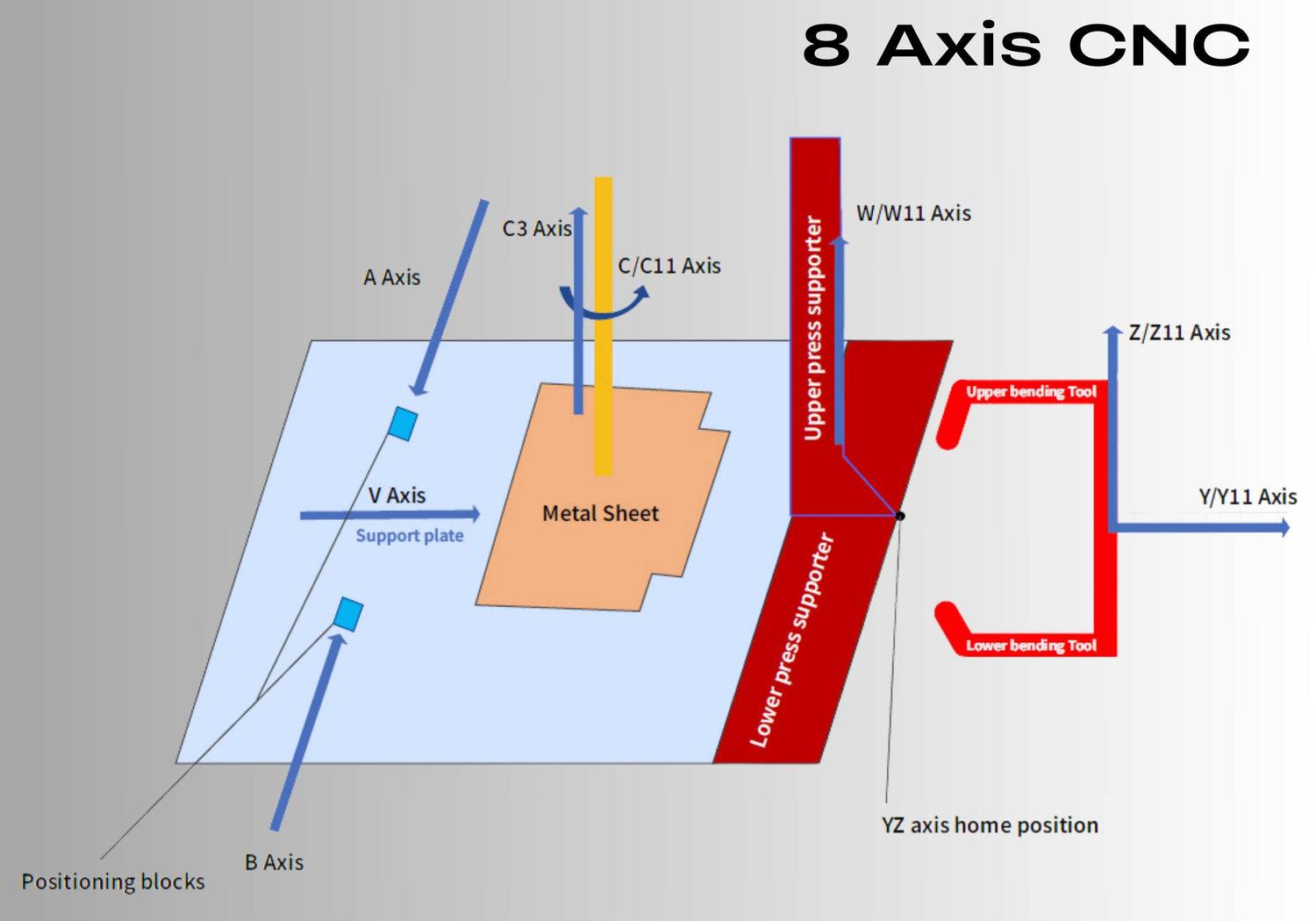 Our Panel metal bender has 8 Axis automatic high precision movements (A, B, V, C3, C11, W11, Z11, Y11)